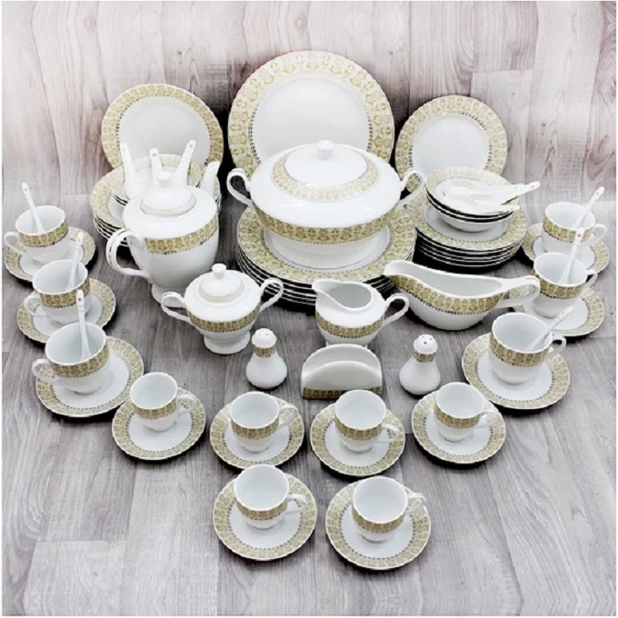 Service à Table 72 Pièces Céramique BRAVO - 6 Assiettes de dîner 10.5" - 6 Assiettes de Soupe 8" - 6 Assiettes Plats 7.5" - 6 Saladiers 5.5" - 6 Tasses à thé - 6 Sous Tasses à thé - 6 Tasses à café - 6 Sous Tasses à café - 6 Cuillers à Thé - 6 Cuillers à Café - 1 Théière avec Couvercle - 1 Soupière avec couvercle - 1 Salière - 1 Saucière - 1 Poivrière - 1 Porte-serviettes
